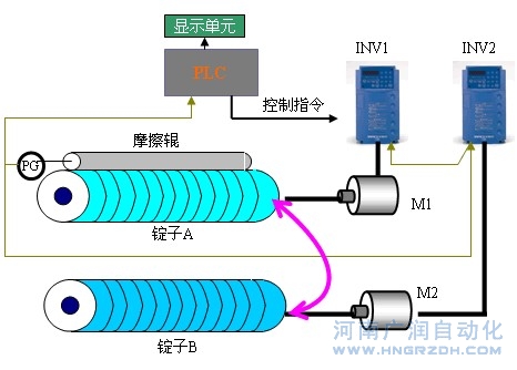 以一臺PLC作為核心控制單元,控制v/f與PID,升速及換軸等信號的邏輯切換,并以PLC接收的傳感器信號經計算轉換后作為線速度的顯示。