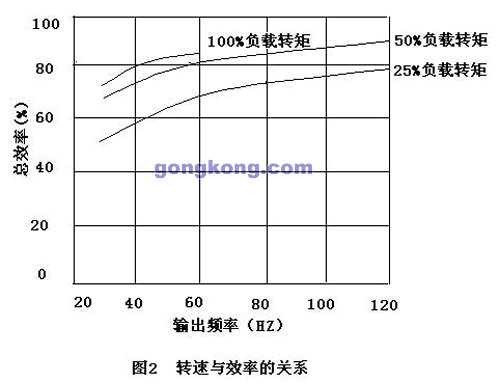 由上式,假設總效率(ηINV*η m)對于電機的轉速為一定。則顯然電機轉速下降將引起電機輸出功率P減小,與其成比例的變頻器輸入功率PIN也減小,即消耗電能降低。但是如圖2所示,為使電機轉速下降而使變頻器輸出頻率降低,則總效率也降低。但因頻率降低的幅度大于總效率降低的幅度,因此,與原先的控制方式相比,仍有顯著的節能效果。另外,電磁調速電機、鼠籠電機的定子電壓控制等從前的調速電機,轉速下降時,總效率將大幅度降低,因而基本上得不到低速時的節能效果。因此采用變頻器取代這些從前的調速方式,可以充分的節能。