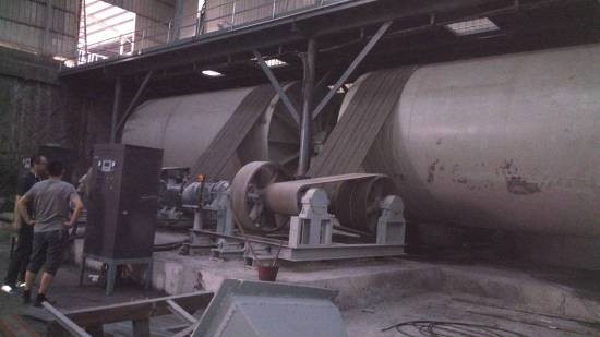 驅動筒體旋轉的動力有主電機和輔助電機。主電機軸通過減速機及皮帶后驅動筒體旋轉,輔助電機和主電機為互鎖工作。當加料或啟動時輔助電機工作,因輔助電機經二級減速機構,輔機驅動轉筒的速度更慢力矩更大。