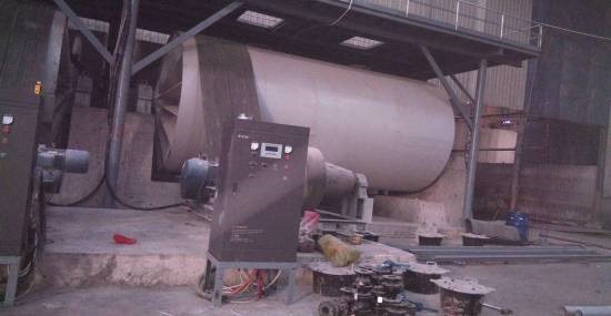 裝原料時啟動輔助電機以較慢速度旋轉,將進料口旋轉到一個特定位置對準接口進料,待磨原料裝機后,因原料沉淀于底部直接用主機啟動會造成皮帶打滑,此時先用輔機先慢速工作一段時間,將原料搖均勻后再用主電機快速帶動轉筒旋轉。
