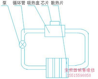 目前,很多簡易變頻器裝置都是用水冷裝置作為散熱系統(tǒng)。水冷散熱系統(tǒng)是一個密閉的液體循環(huán)裝置,如圖2所示,通過泵產(chǎn)生的動力,推動密閉系統(tǒng)中的液體循環(huán),將吸熱盒吸收的芯片產(chǎn)生的熱量,通過液體的循環(huán),帶到面積更大的散熱裝置,進行散熱。冷卻后的液體再次回流到吸熱設(shè)備,如此循環(huán)往復(fù)。另外還有一種水冷散熱方式是通過不斷補充新的冷卻水進行裝置的冷卻,將吸收了熱量的水直接排出裝置,但是這種水冷方式耗水量大只適用于一些特殊的場合,所以一般用前一種水冷方式。因水冷系統(tǒng)沒有風(fēng)扇,所以不會產(chǎn)生振動,噪聲也相對較小。其缺點是價格比較昂貴,而且水在密閉狀態(tài)下容易發(fā)生結(jié)垢、變質(zhì),在使用過程中還要完全杜絕漏水、斷水等情況的發(fā)生。同時該系統(tǒng)在使用過程中由于水的流動會造成電子元件周圍電磁場的一些變化,可能會影響到系統(tǒng)的穩(wěn)定性。