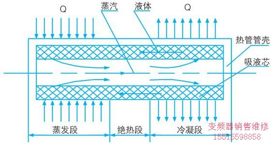 熱管是一種傳熱性極好的人工構(gòu)件,它利用“相變”傳熱的原理,與一般金屬材料實體材料和天然傳熱方式完全不同。熱管的結(jié)構(gòu)是靈活多樣的,相互之間差別很大,典型的熱管如圖3所示,由管殼、吸液芯、工作介質(zhì)等組成。將管內(nèi)氣體抽出部分,變?yōu)槎ㄖ档呢搲汉蟪湟赃m量的工作液體,使緊貼管內(nèi)壁的吸液芯毛細多孔材料中充滿液體后加以密封。管的一端為蒸發(fā)段(加熱段),另一端為冷凝段(冷卻段),兩段中間布置絕熱段。液體介質(zhì)從蒸發(fā)段吸收熱源產(chǎn)生的熱量汽化后,在微小的壓差作用下,迅速流向冷凝段,通過向冷源放出潛熱而凝結(jié)成液體,凝結(jié)液再在吸液芯毛細抽吸力的作用下從冷凝段流回蒸發(fā)段。如此循環(huán)往復(fù),不斷將熱量自蒸發(fā)段傳遞向冷凝段。熱管比較大的優(yōu)點是能在溫差很小的情況下傳遞大量熱量,其相對導(dǎo)熱率是銅的幾百倍,被稱為“近超導(dǎo)熱體” [5]。