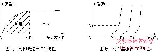 如圖六,比例調速閥的流量Q是由閥兩端的壓力差△P建立起來的。顯然,壓力差△P越大,其油路加速就越快。又由圖七,比例溢流閥的壓力P是隨著溢流Q的增大而提高的。由此得出結論:在同樣設定下,溢流量越多,調速閥兩端的壓力差就越大,加速也就越快。很明顯,定量泵的溢流量總會大于變量泵,其調速閥兩端的壓力差△P也要大些。所以,同樣設定下,定量泵系統要比變量泵系統加速快,承受負載的能力更強。