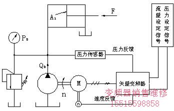 如圖三,該系統采用矢量變頻器驅動電機及定量泵,取消了傳統油路中的比例調速閥及比例溢流閥。油路中的調速功能由矢量變頻器直接控制電機及油泵轉速來完成,而壓力控制由壓力傳感器和變頻器的構成閉環PID功能來完成。因此,變頻器的頻率給定信號以塑機流量及壓力信號為準。另外,根據產品工藝及成本控制的需要,電機可選用加裝速度編碼器的普通電機或變頻專用電機。