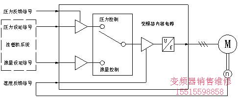 如下圖四,變頻器控制系統配備一塊智能轉換卡,可根據注塑機壓力反饋值的大小,自動轉換塑機的流量控制及壓力控制狀態。當油泵壓力P接近或達到塑機設定值時,油路油路進入壓力控制狀態,這時仍用流量設定值來控制變頻器頻率顯然是不合適的。