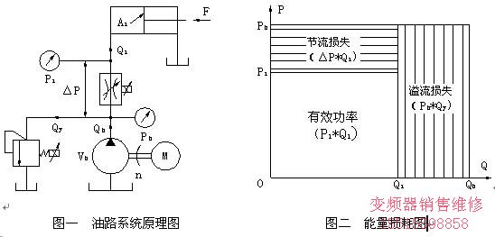 需指出的是,在傳統定量泵油路中(參見圖一),系統處于流量控制狀態時,油泵壓力P必定大于工作壓力P,它們之間需要產生足夠壓力差△P來驅動比例調速閥工作,這是調速閥的工作特性。而變頻注塑機是通過調節油泵轉速直接控制油泵流量,而油泵壓力P取決于工作負載,即P= F/A。由此,負載需要多少流量、壓力,油泵就相應輸出多少,實現了負載自適應控制,無能量損失。