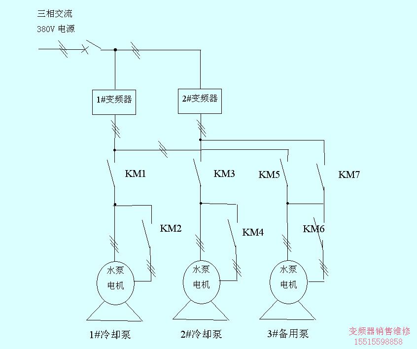 這是應用得較為普遍的方案,其控制過程是:用水量少時由變頻器控制1號泵,進行調節控制.當用水量逐漸增加,1號泵的工作頻率達到接近50hz時,將其電動機切換成工頻電源供電.同時將變頻器切換到2號泵上,由2號泵進行補充供水.反之,當用水量逐漸減少,即使2號泵的工作頻率已降為下限頻率,而供水壓力仍偏大時,則關掉1號泵,同時迅速升高2號泵的工作頻率.并進行恒壓控制.此方案的主要特點是只用一臺變頻器,故設備投資少,但如果用水量恰巧在1臺泵全速供水量上下變動時,將會出現供水系統來回切換的狀態。為了避免這種現象的發生,可將供水壓力設定一個范圍,此方法適用于控制精度要求不是很高的場合。此方案取用電功率的計算如下: