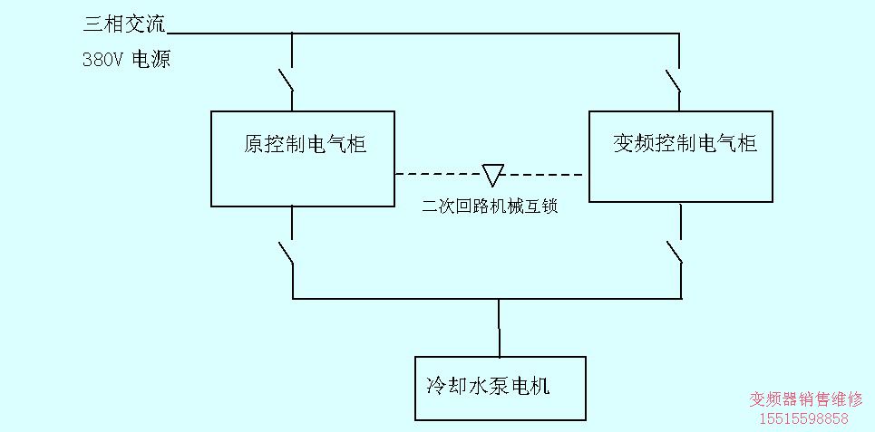 本方案在不改變原工頻系統控制模式的基礎上進行改造。變頻控制模式與原控制模式可以通過切換開關的轉換,獨立地對冷卻水泵進行控制。這樣既保留了原工頻系統的控制模式,又為改造后的變頻控制系統提供一個獨立的備用系統。同時這樣做對原系統改造少,施工方便,改造過程不影響原系統的正常運行。圖1所示為變頻系統與原工頻系統切換示意圖,為了確保系統工作安全,采用機械互鎖與ddc互鎖的雙重保護模式。