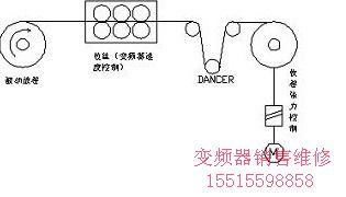 3,收卷:線速度同步+恒張力控制,有跳舞輪位置反饋,變頻器作閉環工藝控制,控制跳舞輪的位置。