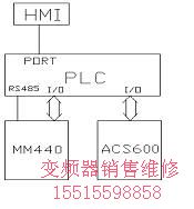 兩臺變頻器的起動/停止,故障報警全部通過數字I/O點控制;收卷跳舞輪位置控制由ACS600獨立完成;主機轉速由S7-200 PLC通過RS485串行通訊口給定。