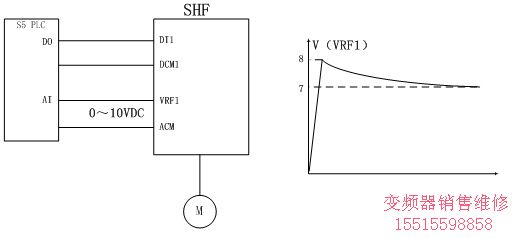 | 變頻器頻率由面板設定,輸入電壓指令(由VRF1輸入的0—10VDC)及運轉指令由外部PLC給定。輸入電壓指令由PLC根據設備所需的張力大小經計算轉換后給出(如上圖右),且可由操作面板的設定單元進行微調。 | |||||||||||||||||||||||||