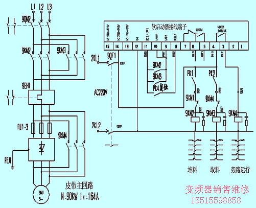 懸臂皮帶機控制如附圖所示:電動機主回路由斷路器9QM2,正反轉控制接觸器9KM2、9KM3,旁路運行接觸器9KM4,熱繼電器9EH1、半導體保護熔斷器FU1-3,軟起動器CMC-S組成(斗輪驅動電機單向運行其控制原理與懸臂皮帶機控制相同)。