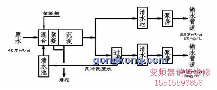 水廠位于中國西北地區一重化工基地,承擔向整個重化工基地提供滿足要求的工業用水和生活用水,設計規模40萬m3/d,工藝流程見下圖: