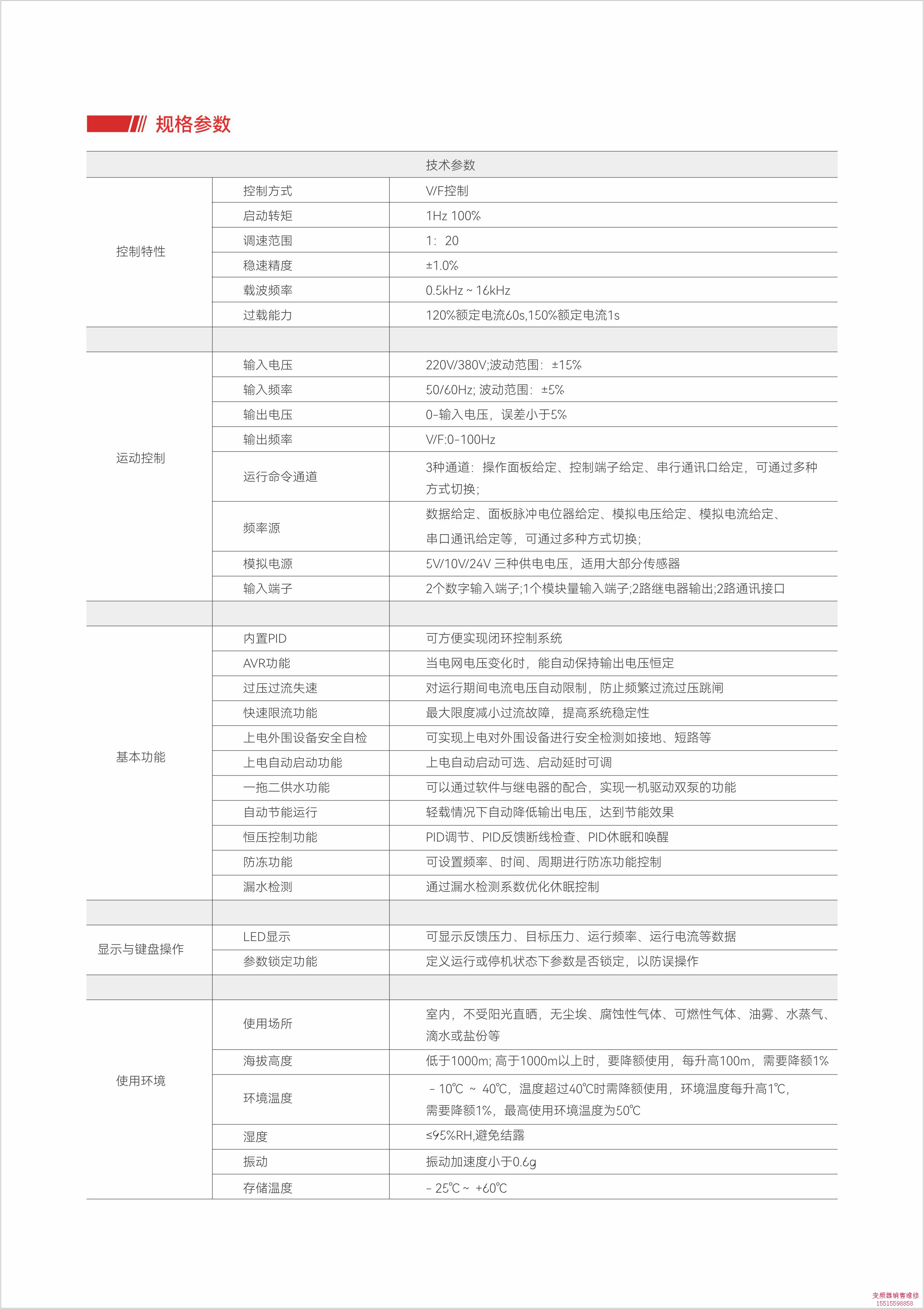 設備過流、過壓、過熱、短路保護,電機輸出短路保護; 水壓高壓、低壓、缺水空轉(zhuǎn)、防凍保護、缺水復位功能。