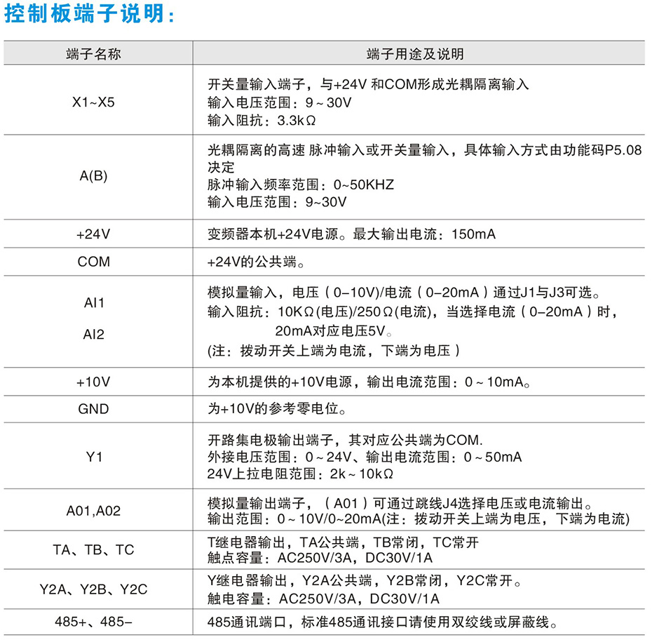 | 信號 | 外部端子 | 電位器5K/0.5W,模擬量輸入設定,遠程通訊設定(RS-485) | |