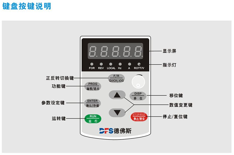 內置8個功能鍵,5位數的LED顯示器,6個狀態指示燈,可設定頻率、自定義模擬量,顯示實際輸出頻率、輸出電流、輸出電壓、輸出功率、輸出轉矩,反饋模擬置,使用者自定義單位,異常故障顯示,參數瀏 覽及修改設定及參數鎖定。 | ||